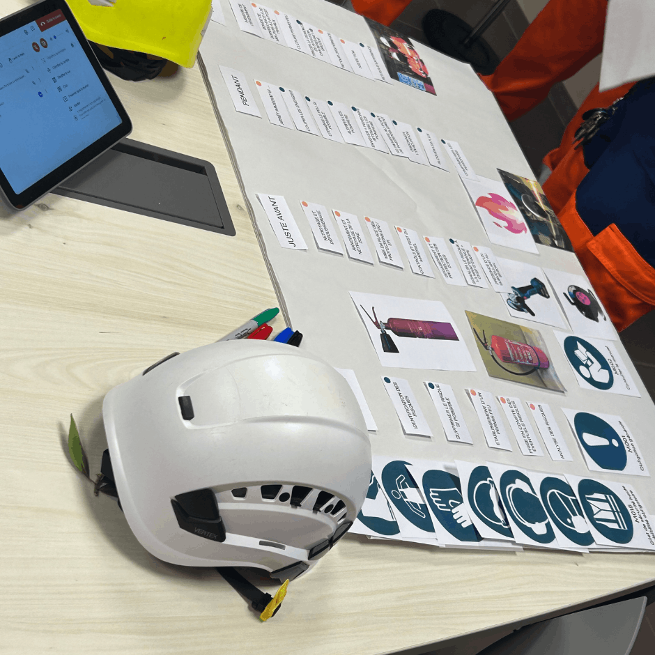 Quoi : Le serious-game permet d’aborder différents scénarios que nous travaillons en amont et ensuite proposons aux équipes. Elles doivent identifier le matériel, les EPI, les accessoires à adapter ainsi que les process à mettre en place via leur roadmap.